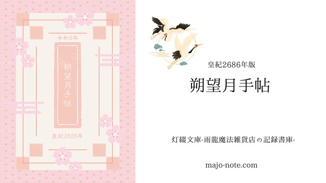 ご予約分で完売した【朔望月手帖 皇紀2685年版】 再販が決定いたしました。 【朔望月手帖 皇紀2685年版】 この特別な手帖は「今世を味わって幸せに生きる」をテーマに作られ、 旧暦と二十四節氣の知恵を取り入れた、一年を通じて心と体を整えるためのパートナーです。 朔望月手帖は自然のリズムに寄り添い、心と体のバランスを整えるためにデザインされています。 季節の移ろいを感じながら、毎日を豊かに過ごすことができるようサポートします。 【Structure and Features】 旧暦と二十四節氣: 新月から次の新月の前日までを1か月とした旧暦と、二十四節氣がメインのマンスリーページで構成されています。 マンスリーページ 旧暦と新暦の両方を掲載し、シンプルなデザインで使いやすさを追求しています。 イラストやコラージュ、デコレーションなど、自由にカスタムしてください。 QRコード 各月の詳細ページには、二十四節氣のならわしやエネルギーを活かすアクションやレシピが掲載されており、QRコードを通じて簡単にアクセスできます。 縦書きレイアウト 基本的なエネルギーの流れである『上から下』『右から左』という方向を取り入れた縦書きレイアウトを採用。自分自身のエネルギーを自然のエネルギーと調和させることを目的としています。 記載暦注一覧 二十四節氣、五節句、Wiccaのサバト、天赦日、鬼宿日、天一天上、土用、土用間日、八専、八専間日、一粒万倍日、庚申日、辛酉日などの選日を記載。 手帖の使い方 朔望月手帖は日々の予定を管理し、心身のバランスを保つためのツールです。 ・心身の調整 季節のエネルギーを取り入れ、ストレスを軽減し、リラックスした日々を送ることを目指します。 ・豊かな生活 二十四節氣に合わせた行動を取り入れることで、四季の変化を楽しみ、日々の生活に新たな発見や喜びをもたらします。 ・自己成長 自分自身のリズムを把握し、無理なく成長していくことができます。 Spec A5サイズ 63ページ Price:¥2,500-(税込:送料別) 本文:上質紙 カパー:エスプリFP 製本方法:中綴じ 令和7年1月29日(旧暦1月1日)はじまり ※加島にある雑貨屋Tickle。-ティカ-さんでもご注文を承ります。 Tickle。-ティカ-さんに実物のサンプルもありますので、ぜひお手に取ってみてください。 ココロくすぐる雑貨と出会えるお店 雑貨屋Tickle。-ティカ- 大阪市淀川区加島3-5-17 JR東西線 加島駅より徒歩5分 私たちModern Traditional Witchcraft雨龍魔法雑貨店は月の満ち欠けを始めとする旧暦や二十四節氣にフォーカスして日常を過ごすことにしています。 旧暦と二十四節気は、古くから日本の生活に深く根付いており、自然との調和を大切にしてきました。 この手帳は、現代の忙しい生活の中でも自然のリズムを取り戻し、心と体のバランスを整えることを目指しています。旧暦と二十四節気に基づくスケジュールは、季節の移り変わりを感じながら日々を過ごすための一助となります。 旧暦を活かし、自分自身の生活スタイルを見つめ直す手助けをするこの手帳は、日々の忙しさに追われる現代人に最適です。 自然と調和した生活を送りたい方に、ぜひお手元にお迎えいただきたい一品です。 今回も数に限りがございますので、お早めにお申し込みください。 ◽︎サンプルあります◽︎ 今年は多くの方から早く使いたいというお声をいただきました。そこで、正式スタート前に旧暦師走(12/31~1/28)のサンプルデータを公開することにしました。この期間をスケジュール帖としてご活用いただきながら、正式版のスタートをお待ちいただければ幸いです。 なお、手帳はA5サイズですが、 データは見開きのイメージを掴んでいただけるようA4判で作成しています。 サンプルデータは以下のリンクからご覧いただけます。 https://www.canva.com/design/DAGZ_f-6euE/1ot_yANQnGN2nBYL5JQksg/view?utm_content=DAGZ_f-6euE&utm_campaign=designshare&utm_medium=link2&utm_source=uniquelinks&utlId=hdb69c4fce6 サンプルデータはCanvaの公開リンクからご覧いただけます。 Canvaの公開リンクはCanva会員でなくてもアクセス可能です。 リンクから直接印刷はできませんので、ブラウザの印刷機能を使用するか、PDFデータとして保存してから印刷してください。 ただし、ブラウザの印刷機能やPDFの印刷についてはサポート外ですので、ご了承ください。 PDFデータをご希望の場合は、個別でご連絡いただければGoogleドライブを通じて配布いたします。 ご希望の方は、https://majo-note.com/contact/ もしくは公式ライン@497ewrsi https://lin.ee/Yotf04C までお知らせください。